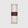A heritage material from the archive, GG Supreme has been reimagined in Gucci Love Parade in different color combinations and combined with contemporary as well as classic styles. The Ophidia shoulder bag is presented in a beige and white variation of the signature material with a tonal trim. Originally a play on a '30s design, the canvas speaks to the historical narrative that runs throughout the collection.