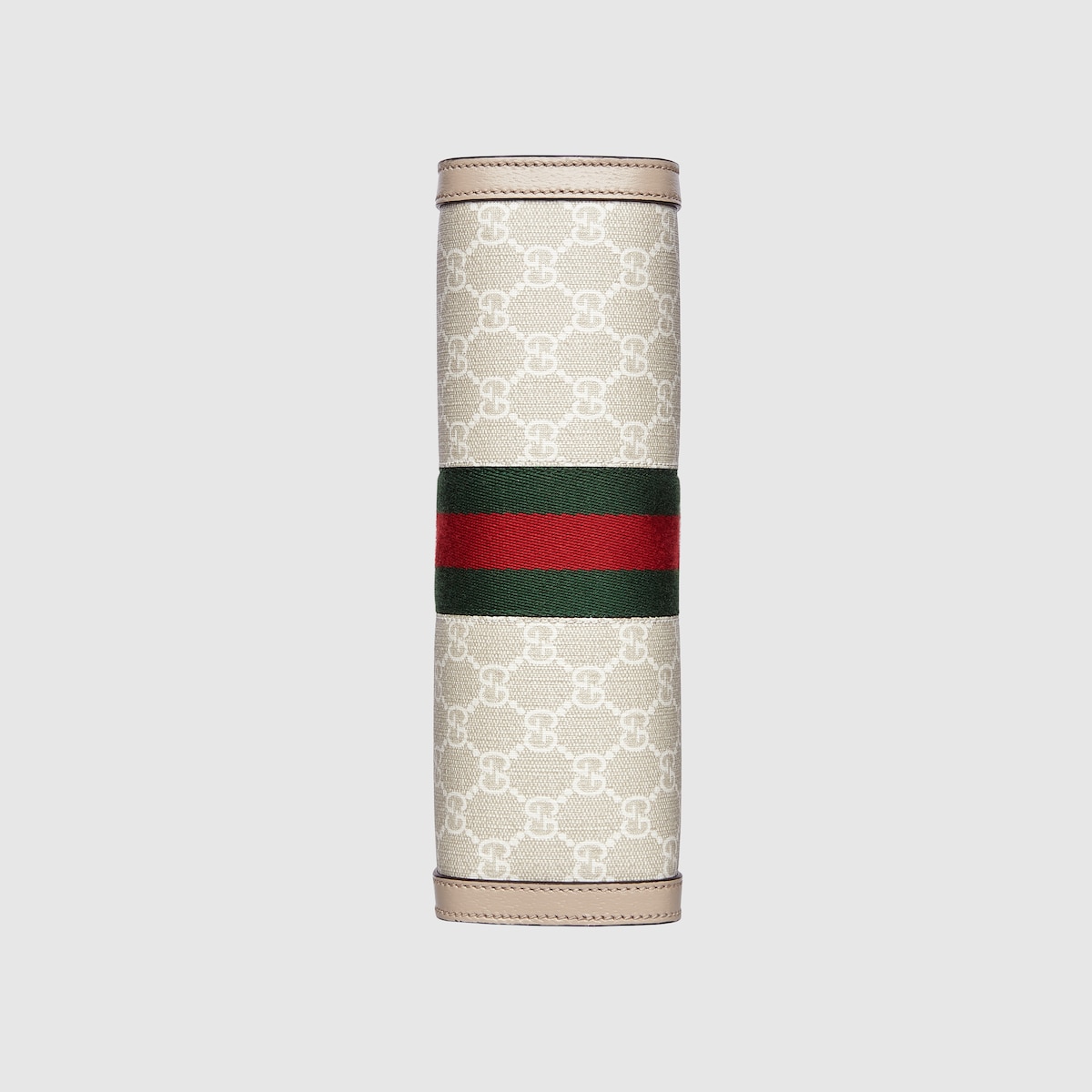 A heritage material from the archive, GG Supreme has been reimagined in Gucci Love Parade in different color combinations and combined with contemporary as well as classic styles. The Ophidia shoulder bag is presented in a beige and white variation of the signature material with a tonal trim. Originally a play on a '30s design, the canvas speaks to the historical narrative that runs throughout the collection.