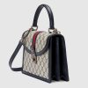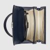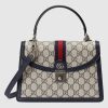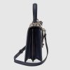 Mirroring the material’s historic origins, GG Supreme is introduced in a timeless mix of blue and beige for Gucci Love Parade. The canvas has come to the front of each collection decade after decade to become a hallmark of the House. Here, the classic palette defines this small-sized Ophidia top handle bag.