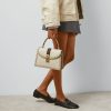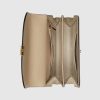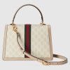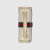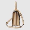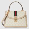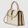 Colors tell a story throughout Gucci Love Parade. One of the House’s most emblematic materials, the GG Supreme is inspired by an archival design from the ’30s. Traditionally presented in beige and ebony, the canvas is presented in a beige and white combination as an ode to timeless pieces and everlasting design. Here, the pattern defines this small-sized Ophidia top handle bag.