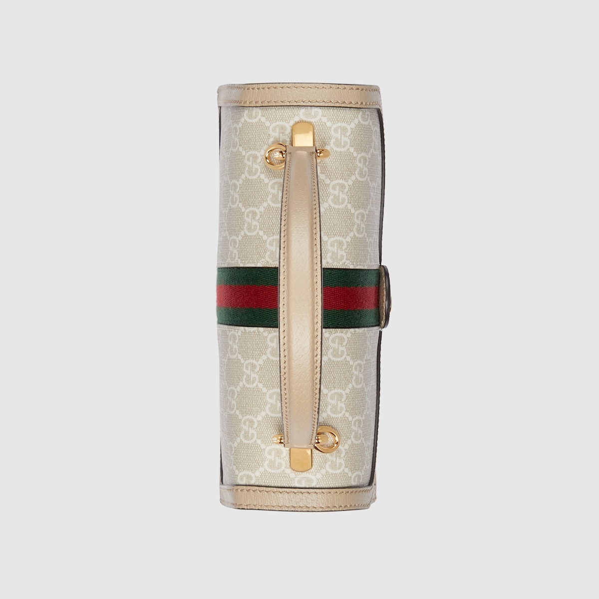 Colors tell a story throughout Gucci Love Parade. One of the House’s most emblematic materials, the GG Supreme is inspired by an archival design from the ’30s. Traditionally presented in beige and ebony, the canvas is presented in a beige and white combination as an ode to timeless pieces and everlasting design. Here, the pattern defines this small-sized Ophidia top handle bag.