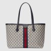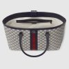 Mirroring the material’s historic origins, GG Supreme is introduced in a timeless mix of blue and beige for Gucci Love Parade. The canvas has come to the front of each collection decade after decade to become a hallmark of the House. Here, the classic palette defines this medium-sized Ophidia tote bag, completed by the Web stripe in red and blue.