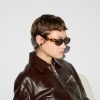 The Cruise 2025 eyewear collection crafts an oval silhouette with ReAce acetate for a contemporary design. These sunglasses feature a Gucci logo on the temples.