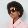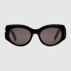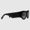 Inspired by the summer spirit and beach clubs on the Italian coast, this item is part of Gucci Lido. For Cruise 2024, the eyewear selection is defined by archival silhouettes reinterpreted with a contemporary touch. Here, a black oval injection frame is decorated with a tone-on-tone Double G logo detail on the temples. Solid grey lens completes the accessory.