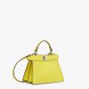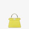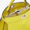 Iconic Peekaboo ISeeU bag in an ideal compact size, made with 306 hand-sewn tone-on-tone macro topstitches, an emblem of the iconic Selleria workmanship. Made of acid yellow Cuoio Romano leather, calfskin with a characteristic natural grain, produced with a metal-free tanning process. Featuring a calfskin-lined interior with two internal compartments divided by a stiff Cuoio Romano leather partition, one internal pocket. Selleria logo plate in silver, palladium-finish metalware. Decorated with the iconic twist lock on both sides. Can be carried by hand, on the shoulder or crossbody thanks to the handle and the adjustable, removable shoulder strap. Made in Italy