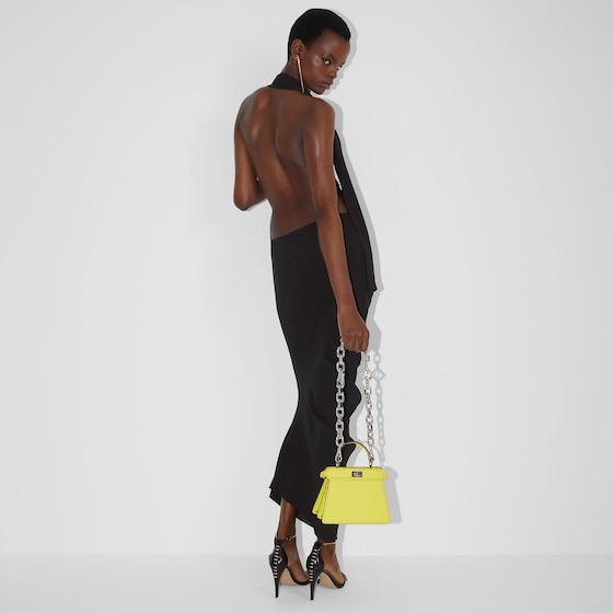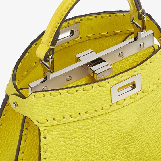 Iconic Peekaboo ISeeU bag in an ideal compact size, made with 306 hand-sewn tone-on-tone macro topstitches, an emblem of the iconic Selleria workmanship. Made of acid yellow Cuoio Romano leather, calfskin with a characteristic natural grain, produced with a metal-free tanning process. Featuring a calfskin-lined interior with two internal compartments divided by a stiff Cuoio Romano leather partition, one internal pocket. Selleria logo plate in silver, palladium-finish metalware. Decorated with the iconic twist lock on both sides. Can be carried by hand, on the shoulder or crossbody thanks to the handle and the adjustable, removable shoulder strap. Made in Italy