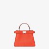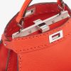 Iconic Peekaboo ISeeU bag in an ideal compact size, made with 306 hand-sewn tone-on-tone macro topstitches, an emblem of the iconic Selleria workmanship. Made of red Cuoio Romano leather, calfskin with a characteristic natural grain, produced with a metal-free tanning process. Featuring a calfskin-lined interior with two internal compartments divided by a stiff Cuoio Romano leather partition, one internal pocket. Selleria logo plate in silver, palladium-finish metalware. Decorated with the iconic twist lock on both sides. Can be carried by hand, on the shoulder or crossbody thanks to the handle and the adjustable, removable shoulder strap. Made in Italy