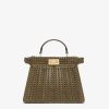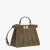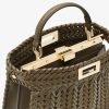 Iconic small Peekaboo ISeeU bag, the epitome of Fendi craftsmanship and creativity. A timeless icon, the Peekaboo was created in 2009. Like the children’s game it takes its name from, peek-a-boo, the bag plays with the beauty showcased on the outside and that concealed on the inside. Made of green calfskin, embellished with hand-crafted interlacing in tone-on-tone leather and suede. Featuring an unlined interior, two internal compartments divided by a stiff calfskin partition, internal pocket. Gold-finish bar, closure and metalware. Decorated with the iconic twist lock on both sides. The bag can be carried by hand or worn either on the shoulder or cross-body thanks to the handle and adjustable, detachable calfskin shoulder strap. Made in Italy