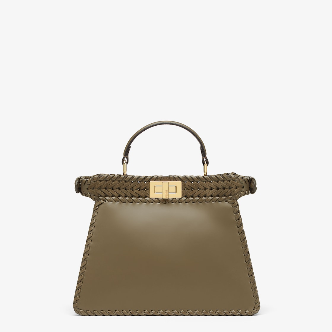 Iconic small Peekaboo ISeeU bag, the epitome of Fendi craftsmanship and creativity. A timeless icon, the Peekaboo was created in 2009. Like the children’s game it takes its name from, peek-a-boo, the bag plays with the beauty showcased on the outside and that concealed on the inside. Made of green calfskin, embellished with hand-crafted interlacing in tone-on-tone leather and suede. Featuring an unlined interior, two internal compartments divided by a stiff calfskin partition, internal pocket. Gold-finish bar, closure and metalware. Decorated with the iconic twist lock on both sides. The bag can be carried by hand or worn either on the shoulder or cross-body thanks to the handle and adjustable, detachable calfskin shoulder strap. Made in Italy