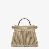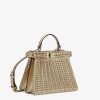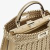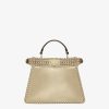 Iconic small Peekaboo ISeeU bag, the epitome of Fendi craftsmanship and creativity. A timeless icon, the Peekaboo was created in 2009. Like the children’s game it takes its name from, peek-a-boo, the bag plays with the beauty showcased on the outside and that concealed on the inside. Made of champagne-colored metallic calfskin, embellished with hand-crafted interlacing in tone-on-tone soft nappa leather. Featuring a partially lined interior, two internal compartments divided by a stiff partition, internal pocket. Gold-finish bar, closure and metalware. Decorated with the iconic twist lock on both sides. The bag can be carried by hand or worn either on the shoulder or crossbody thanks to the handle and adjustable, detachable shoulder strap. Made in Italy