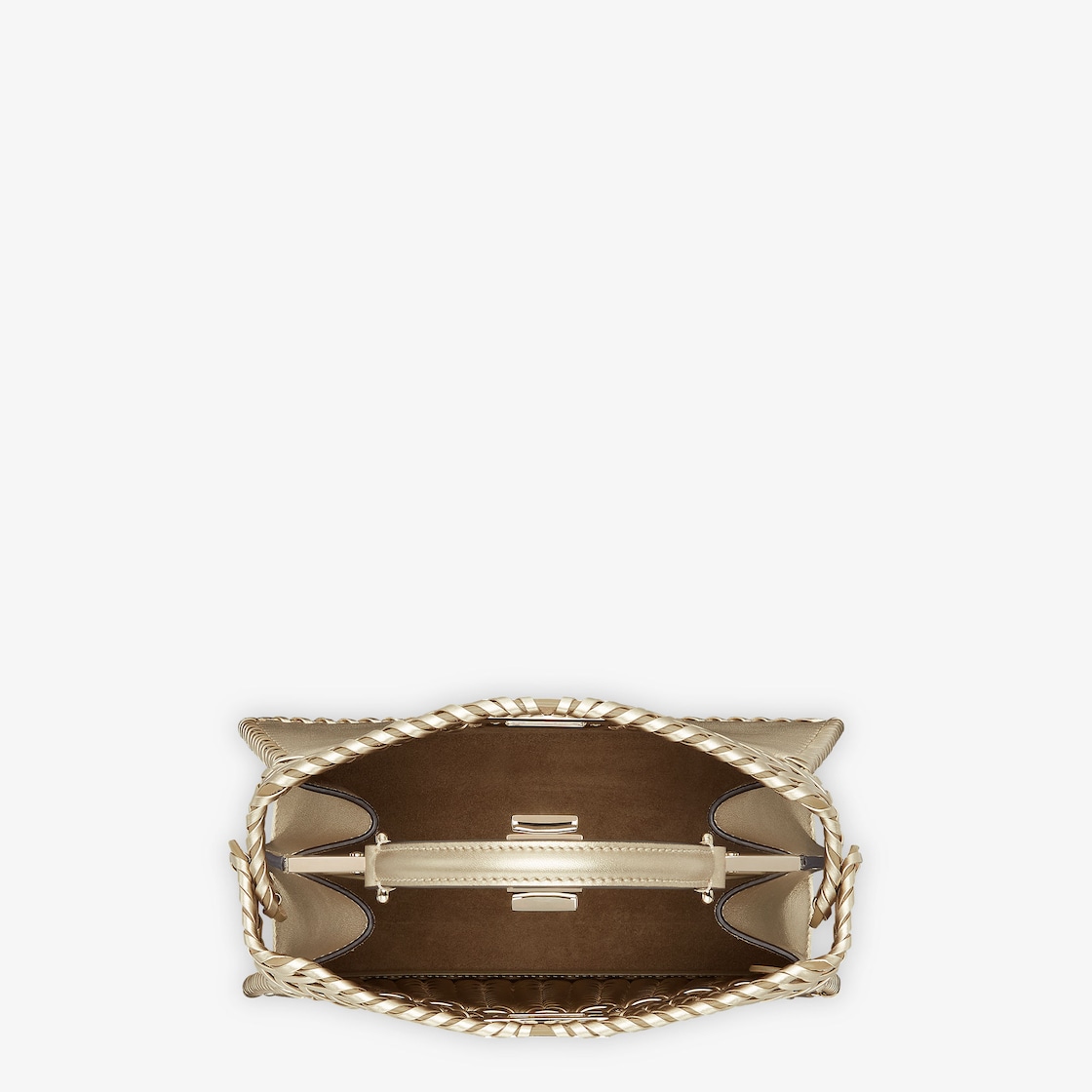 Iconic small Peekaboo ISeeU bag, the epitome of Fendi craftsmanship and creativity. A timeless icon, the Peekaboo was created in 2009. Like the children’s game it takes its name from, peek-a-boo, the bag plays with the beauty showcased on the outside and that concealed on the inside. Made of champagne-colored metallic calfskin, embellished with hand-crafted interlacing in tone-on-tone soft nappa leather. Featuring a partially lined interior, two internal compartments divided by a stiff partition, internal pocket. Gold-finish bar, closure and metalware. Decorated with the iconic twist lock on both sides. The bag can be carried by hand or worn either on the shoulder or crossbody thanks to the handle and adjustable, detachable shoulder strap. Made in Italy