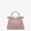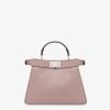 Small iconic Peekaboo ISeeU bag made with 556 hand-sewn macro topstitches, an emblem of the iconic Selleria workmanship handed down through generations of Fendi artisans since 1925. Made of mauve pink Cuoio Romano leather, calfskin with a characteristic natural grain, produced with a metal-free tanning process. Featuring a calfskin-lined interior with two internal compartments divided by a stiff Cuoio Romano leather partition, one internal pocket. Selleria logo plate in silver, palladium-finish metalware. Decorated with the iconic twist lock on both sides. The bag can be carried by hand or worn either on the shoulder or crossbody thanks to the handle and adjustable, detachable shoulder strap. Made in Italy