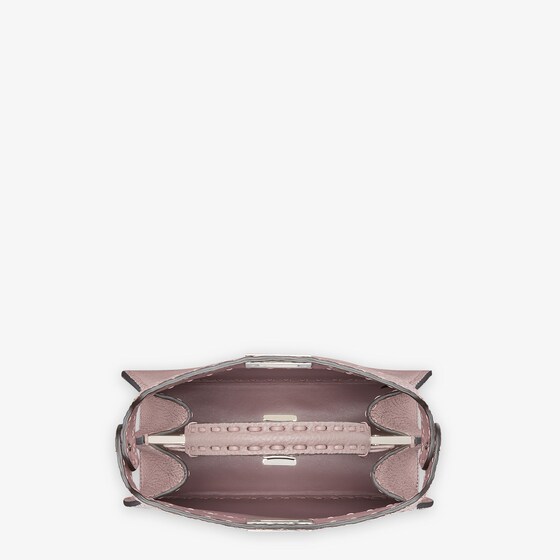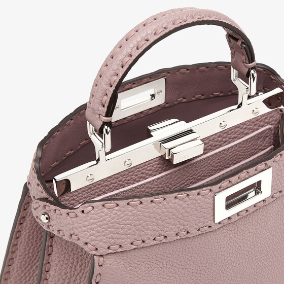 Small iconic Peekaboo ISeeU bag made with 556 hand-sewn macro topstitches, an emblem of the iconic Selleria workmanship handed down through generations of Fendi artisans since 1925. Made of mauve pink Cuoio Romano leather, calfskin with a characteristic natural grain, produced with a metal-free tanning process. Featuring a calfskin-lined interior with two internal compartments divided by a stiff Cuoio Romano leather partition, one internal pocket. Selleria logo plate in silver, palladium-finish metalware. Decorated with the iconic twist lock on both sides. The bag can be carried by hand or worn either on the shoulder or crossbody thanks to the handle and adjustable, detachable shoulder strap. Made in Italy