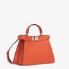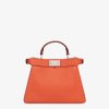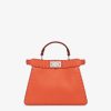 Small iconic Peekaboo ISeeU bag made with 556 hand-sewn macro topstitches, an emblem of the iconic Selleria workmanship handed down through generations of Fendi artisans since 1925. Made of orange Cuoio Romano leather, calfskin with a characteristic natural grain, produced with a metal-free tanning process. Featuring a calfskin-lined interior with two internal compartments divided by a stiff Cuoio Romano leather partition, one internal pocket. Selleria logo plate in silver, palladium-finish metalware. Decorated with the iconic twist lock on both sides. The bag can be carried by hand or worn either on the shoulder or crossbody thanks to the handle and adjustable, detachable shoulder strap. Made in Italy