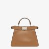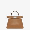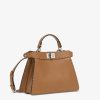 Small iconic Peekaboo ISeeU bag made with 556 tone on tone hand-sewn macro topstitches, an emblem of the iconic Selleria workmanship handed down through generations of Fendi artisans since 1925. Made of coffee-colored Cuoio Romano leather and calfskin with a characteristic natural grain produced with a metal-free tanning process. Featuring a calfskin-lined interior with two internal compartments divided by a stiff Cuoio Romano leather partition, one internal pocket. Selleria logo plate in silver, palladium-finish metalware. Decorated with the iconic twist lock on both sides. The bag can be carried by hand or worn either on the shoulder or crossbody thanks to the handle and adjustable, detachable shoulder strap. Made in Italy