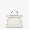 Small iconic Peekaboo ISeeU bag made with 556 tone on tone hand-sewn macro topstitches, an emblem of the iconic Selleria workmanship handed down through generations of Fendi artisans since 1925. Made of white Cuoio Romano leather, calfskin with a characteristic natural grain produced with a metal-free tanning process. Featuring a calfskin-lined interior with two internal compartments divided by a stiff Cuoio Romano leather partition, one internal pocket. Selleria logo plate in silver, palladium-finish metalware. Decorated with the iconic twist lock on both sides. Can be carried by hand, over the shoulder or crossbody thanks to the handle and adjustable, detachable shoulder strap. Made in Italy
