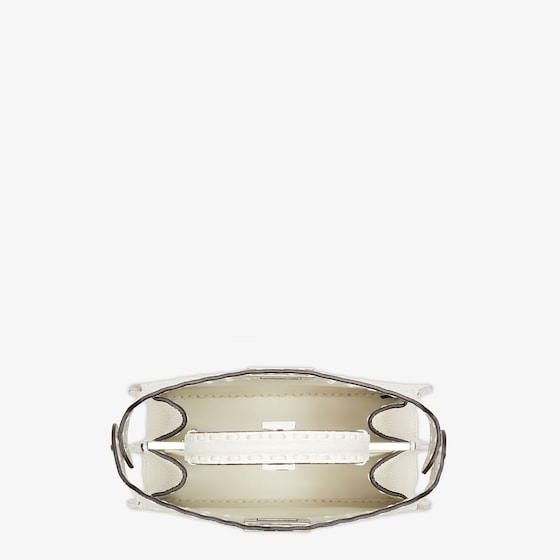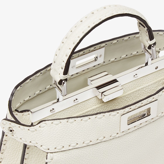 Small iconic Peekaboo ISeeU bag made with 556 tone on tone hand-sewn macro topstitches, an emblem of the iconic Selleria workmanship handed down through generations of Fendi artisans since 1925. Made of white Cuoio Romano leather, calfskin with a characteristic natural grain produced with a metal-free tanning process. Featuring a calfskin-lined interior with two internal compartments divided by a stiff Cuoio Romano leather partition, one internal pocket. Selleria logo plate in silver, palladium-finish metalware. Decorated with the iconic twist lock on both sides. Can be carried by hand, over the shoulder or crossbody thanks to the handle and adjustable, detachable shoulder strap. Made in Italy