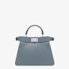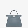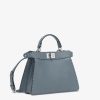 Small iconic Peekaboo ISeeU bag, made with 556 hand-sewn tone-on-tone macro topstitches, an emblem of the iconic Selleria workmanship. Made of blue Cuoio Romano leather, calfskin with a characteristic natural grain, produced with a metal-free tanning process. Featuring a calfskin-lined interior with two internal compartments divided by a stiff Cuoio Romano leather partition, one internal pocket. Selleria logo plate in silver, palladium-finish metalware. Decorated with the iconic twist lock on both sides. Can be carried by hand, over the shoulder or crossbody thanks to the handle and adjustable, detachable shoulder strap. Made in Italy