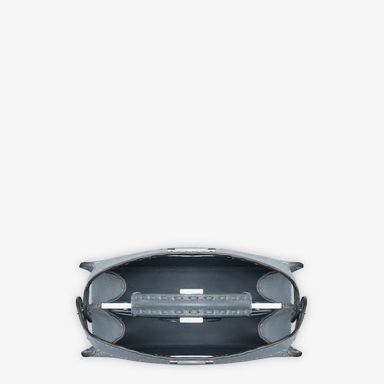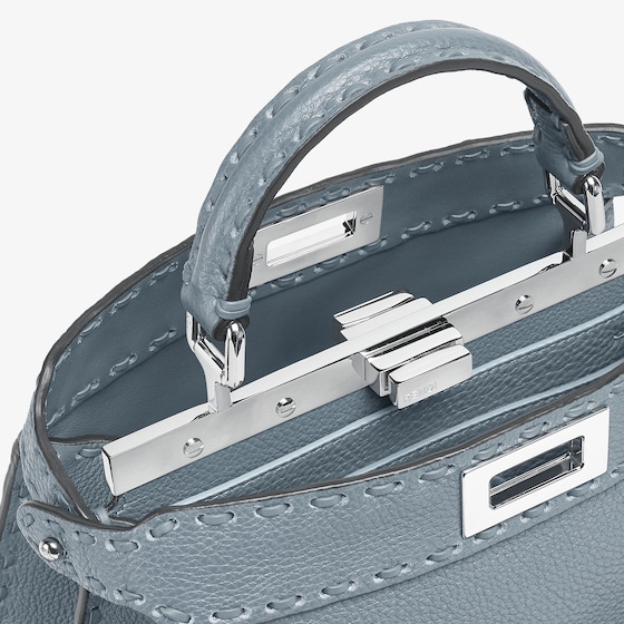 Small iconic Peekaboo ISeeU bag, made with 556 hand-sewn tone-on-tone macro topstitches, an emblem of the iconic Selleria workmanship. Made of blue Cuoio Romano leather, calfskin with a characteristic natural grain, produced with a metal-free tanning process. Featuring a calfskin-lined interior with two internal compartments divided by a stiff Cuoio Romano leather partition, one internal pocket. Selleria logo plate in silver, palladium-finish metalware. Decorated with the iconic twist lock on both sides. Can be carried by hand, over the shoulder or crossbody thanks to the handle and adjustable, detachable shoulder strap. Made in Italy