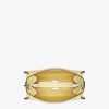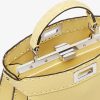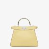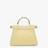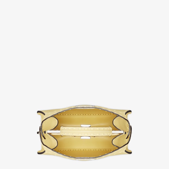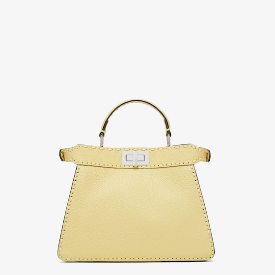 Small iconic Peekaboo ISeeU bag, made with 556 hand-sewn tone-on-tone macro topstitches, an emblem of the iconic Selleria workmanship. Made of yellow Cuoio Romano leather, calfskin with a characteristic natural grain, produced with a metal-free tanning process. Featuring a calfskin-lined interior with two internal compartments divided by a stiff Cuoio Romano leather partition, one internal pocket. Selleria logo plate in silver, palladium-finish metalware. Decorated with the iconic twist lock on both sides. Can be carried by hand, over the shoulder or crossbody thanks to the handle and adjustable, detachable shoulder strap. Made in Italy