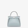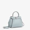 Small iconic Peekaboo bag, made with 220 hand-sewn tone-on-tone macro topstitches, an emblem of the iconic Selleria workmanship. Made of light blue Cuoio Romano leather, calfskin with a characteristic natural grain, produced with a metal-free tanning process. Featuring a lined interior, two internal compartments divided by a stiff Cuoio Romano leather partition, one internal pocket. Selleria logo plate in silver, palladium-finish metalware. Decorated with the iconic twist lock on both sides. The bag can be carried by hand or worn on the shoulder thanks to the stone colored python handle and adjustable, detachable shoulder strap. Made in Italy