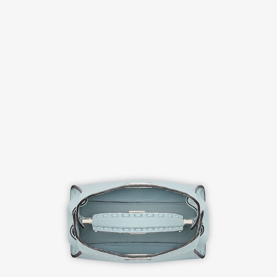 Small iconic Peekaboo bag, made with 220 hand-sewn tone-on-tone macro topstitches, an emblem of the iconic Selleria workmanship. Made of light blue Cuoio Romano leather, calfskin with a characteristic natural grain, produced with a metal-free tanning process. Featuring a lined interior, two internal compartments divided by a stiff Cuoio Romano leather partition, one internal pocket. Selleria logo plate in silver, palladium-finish metalware. Decorated with the iconic twist lock on both sides. The bag can be carried by hand or worn on the shoulder thanks to the stone colored python handle and adjustable, detachable shoulder strap. Made in Italy