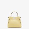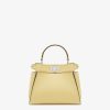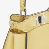 Small iconic Peekaboo bag, made with 220 hand-sewn tone-on-tone macro topstitches, an emblem of the iconic Selleria workmanship. Made of yellow Cuoio Romano leather, calfskin with a characteristic natural grain, produced with a metal-free tanning process. Featuring a lined interior, two internal compartments divided by a stiff Cuoio Romano leather partition, one internal pocket. Selleria logo plate in silver, palladium-finish metalware. Decorated with the iconic twist lock on both sides. The bag can be carried by hand or worn on the shoulder thanks to the stone colored python handle and adjustable, detachable shoulder strap. Made in Italy
