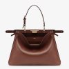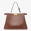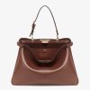 Iconic Large Peekaboo Soft bag, the epitome of Fendi craftsmanship and creativity. A timeless icon, the Peekaboo was created in 2009. Like the children’s game it takes its name from, peek-a-boo, the bag plays with the beauty showcased on the outside and that concealed on the inside. Presented at the Fall-Winter 2024/25 fashion show, it features a soft look that enhances the bag’s “smile” on the front panel. Made of brown calfskin with a silky finish. Featuring a suede-lined interior with two internal compartments divided by a stiff partition and a leather internal pocket with gold-colored FENDI logo print. Leather covered aluminum bar to lighten the weight of the bag, gold-finish clasp and metalware. Decorated with the iconic twist lock on both sides. It can be carried on the shoulder or by hand thanks to the adjustable handle. Made in Italy