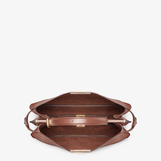 Iconic Large Peekaboo Soft bag, the epitome of Fendi craftsmanship and creativity. A timeless icon, the Peekaboo was created in 2009. Like the children’s game it takes its name from, peek-a-boo, the bag plays with the beauty showcased on the outside and that concealed on the inside. Presented at the Fall-Winter 2024/25 fashion show, it features a soft look that enhances the bag’s “smile” on the front panel. Made of brown calfskin with a silky finish. Featuring a suede-lined interior with two internal compartments divided by a stiff partition and a leather internal pocket with gold-colored FENDI logo print. Leather covered aluminum bar to lighten the weight of the bag, gold-finish clasp and metalware. Decorated with the iconic twist lock on both sides. It can be carried on the shoulder or by hand thanks to the adjustable handle. Made in Italy