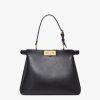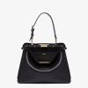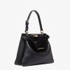 Iconic medium Peekaboo Soft bag, the epitome of Fendi craftsmanship and creativity. A timeless icon, the Peekaboo was created in 2009. Like the children’s game it takes its name from, peek-a-boo, the bag plays with the beauty showcased on the outside and that concealed on the inside. Presented at the Fall-Winter 2024/25 fashion show, it features a soft look that enhances the bag’s “smile” on the front panel. Made of black calfskin with a silky finish. Featuring a suede-lined interior with two internal compartments divided by a stiff partition and a leather internal pocket with gold-colored FENDI logo print. Leather covered aluminum bar to lighten the weight of the bag, gold-finish clasp and metalware. Decorated with the iconic twist lock on both sides. It can be carried on the shoulder or by hand thanks to the adjustable handle. Made in Italy
