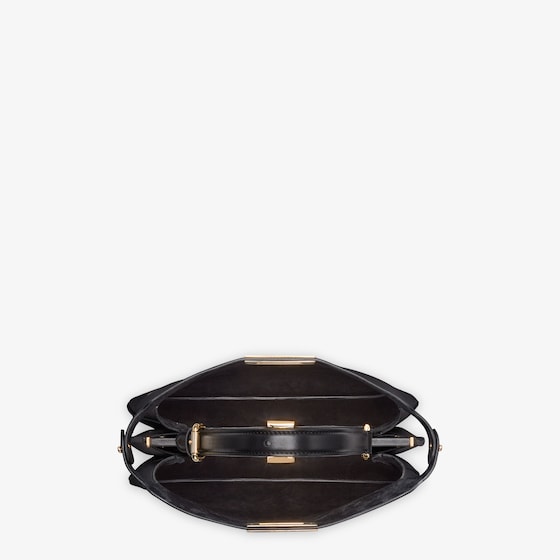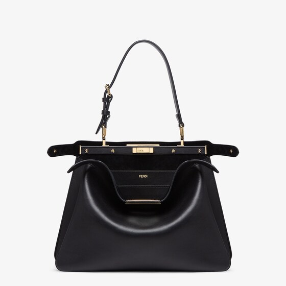 Iconic medium Peekaboo Soft bag, the epitome of Fendi craftsmanship and creativity. A timeless icon, the Peekaboo was created in 2009. Like the children’s game it takes its name from, peek-a-boo, the bag plays with the beauty showcased on the outside and that concealed on the inside. Presented at the Fall-Winter 2024/25 fashion show, it features a soft look that enhances the bag’s “smile” on the front panel. Made of black calfskin with a silky finish. Featuring a suede-lined interior with two internal compartments divided by a stiff partition and a leather internal pocket with gold-colored FENDI logo print. Leather covered aluminum bar to lighten the weight of the bag, gold-finish clasp and metalware. Decorated with the iconic twist lock on both sides. It can be carried on the shoulder or by hand thanks to the adjustable handle. Made in Italy