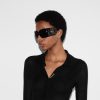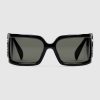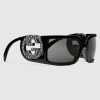 The Cruise 2025 eyewear collection blends a bold silhouette and signature motifs in an elevated design. These shiny black injection frame features a large Interlocking G set with crystals on the temples.