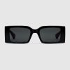 The Cruise 2025 eyewear collection blends a bold silhouette and signature motifs in a contemporary design. These rectangular sunglasses with green and red temples feature a Gucci logo.