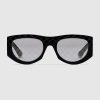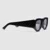 These striking rectangular-frame sunglasses boast a lustrous black acetate construction, intricately adorned with an allover GG engraving. The design is enhanced by solid grey Gucississima lenses, offering a sophisticated blend of modern elegance and signature branding.