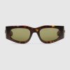 The Pre-Fall 2024 eyewear collection successfully combines the coveted silhouettes of bygone decades with a contemporary logo feel. Here, a shiny dark tortoiseshell acetate frame pairs with double layered acetate temples and an Interlocking G motif.
