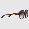 • Shiny dark tortoiseshell acetate temples with bold gold-toned 'Gucci' lettering
