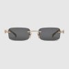 The Cruise 2025 eyewear collection includes a frameless silhouette in a sleek design. These sunglasses feature a Gucci logo on the gold-toned metal temples.