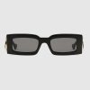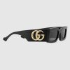 For the Pre-Fall 2023, narrow rectangular frames add a charm to a selection of sunglasses. The signature Double G detail decorates the temples, adorning the silhouette with an archival code. A grey lens completes this black acetate frame.