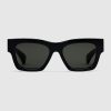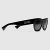 The Cruise 2025 eyewear collection blends an essential silhouette with signature motifs. These rectangular sunglasses are accentuated by a Gucci logo.