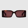 The Cruise 2025 eyewear collection blends a bold silhouette and signature motifs in a contemporary design. These rectangular sunglasses with green and red temples feature a Gucci logo.