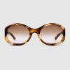 • Shiny tortoiseshell brown acetate see-through temples with enameled Gucci lettering logo, and metal endtips