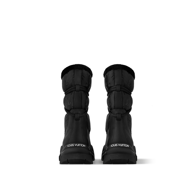 The Ruby flat half boot is ready for winter in a combination of rubber-effect calf leather and Monogram nylon, with a warm shearling lining. This water-repellent, insulated model is complemented by technical details, including wraparound laces with a stopper. It comes on a chunky rubber outsole with distinctive vertical ridges and the Louis Vuitton signature.