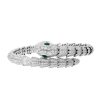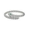 The Serpenti bracelet is a fascinating and enchanting sight, with its enchanting eyes. This elegant jewel lingers on your finger, its beautiful scales gleaming with a moving light, reflecting the unique sinuousness of the snake. The snake’s gaze is further enhanced by the Bvlgari logo: two stunning colored gemstones that are irresistible. Serpenti bracelet in 18K white gold with pavé diamonds and emerald eyes
