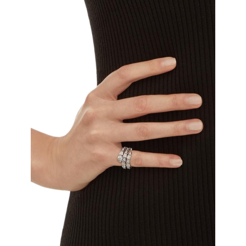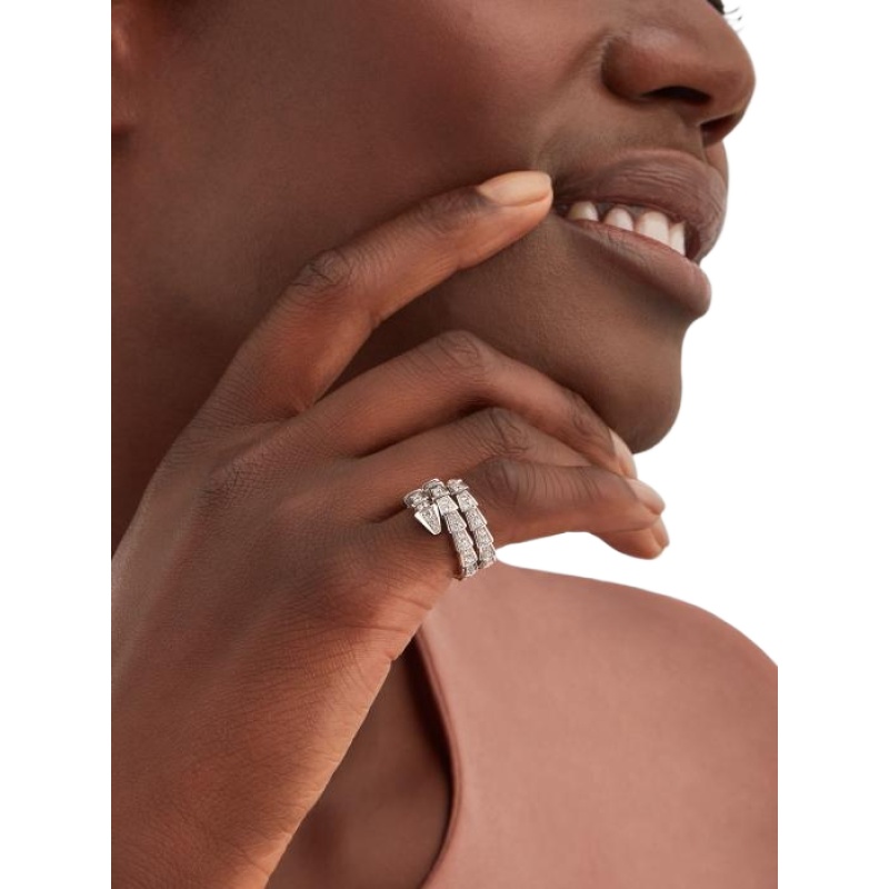 The Serpenti Viper ring in 18K white gold, fully pavé-set with diamonds, is a signature style that combines pure beauty, circumferential shapes and allure, a simple and concise interpretation of the endless transformation and evolution of Bulgari’s classic creations. This glamorous jewelry piece embodies the powerful characteristics of the mysterious snake’s constant transformation, inspiring people to actively seek change and regard it as an inexhaustible source of strength and confidence. It is suitable for mixing and matching at will, providing a variety of styling options, showing the flexible and versatile style of the series.