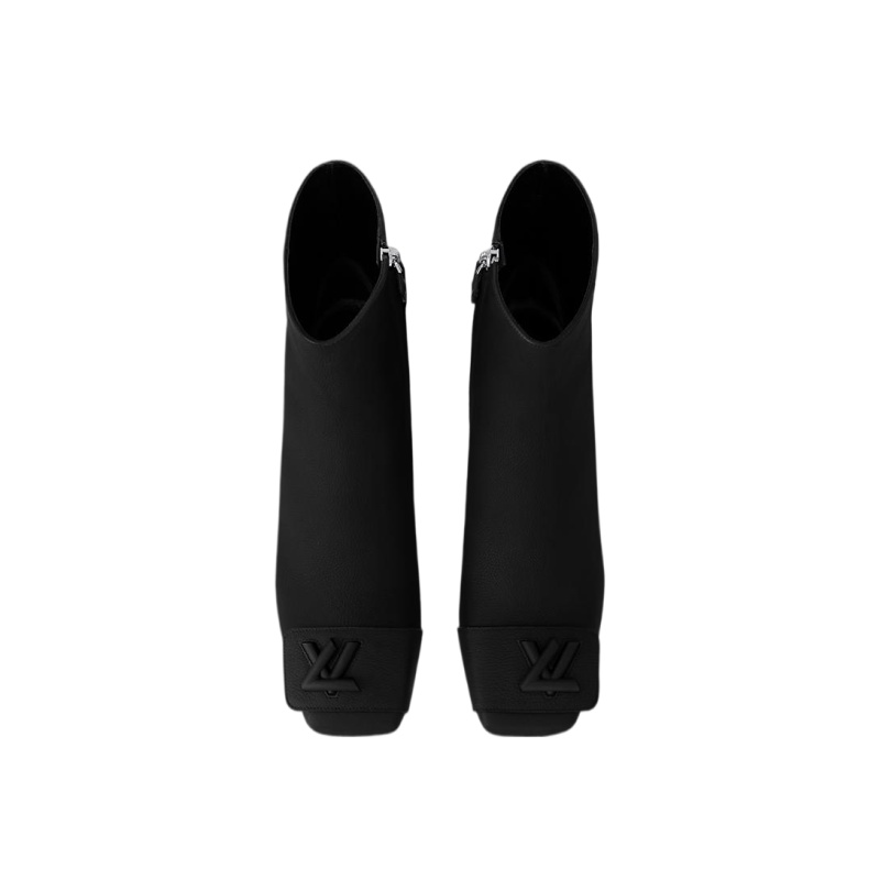 Mat grained calf leather complements the graphic, modern lines of the Shake ankle boot. This model is distinguished by its block heel with a V-shaped cutout and by the LV Twist accessory on its toe, which is matched to the leather for a striking, all-black look. A discreet side zip ensures easy fitting.