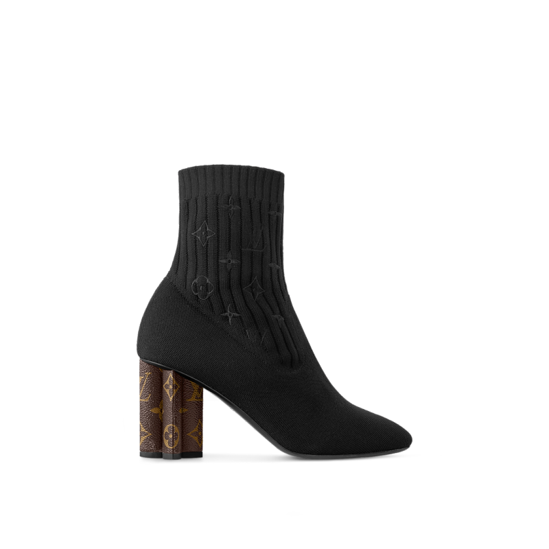 One of Louis Vuitton's most emblematic styles, the Silhouette ankle boot is revisited in black stretch textile, which provides a second-skin fit. The signature of the Silhouette line is its heel, which is shaped like a Monogram Flower and covered in patent Monogram canvas. This model features a padded insock for enhanced comfort.
