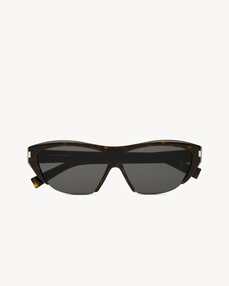 half-rim shield sunglasses with tortoiseshell acetate frames and nylon lenses.