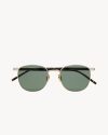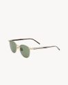 sunglasses with round metal and tortoiseshell injection frames and nylon lenses.