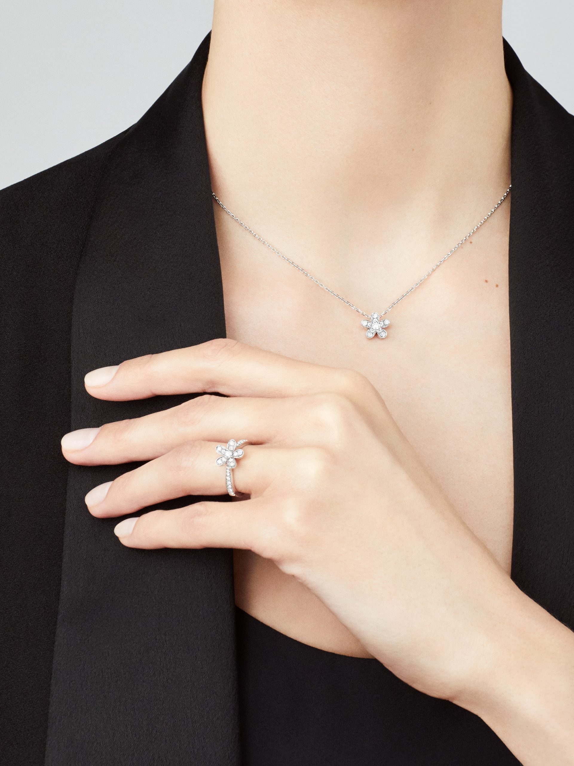 Socrate pendant, 1 flower, rhodium plated 18K white gold, round diamonds; diamond quality DEF, IF to VVS.The pendant is attached to the necklace’s chain