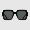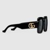 Inspired by the summer spirit and beach clubs on the Italian coast, this item is part of Gucci Lido. This pair of shiny black acetate sunglasses is defined by the elegant silhouette. The solid grey lenses and the iconic gold-toned Double G complete the style.